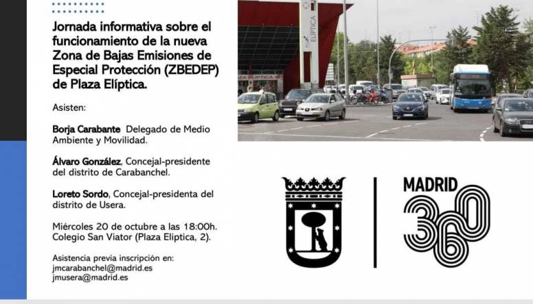 Además de la mencionada web, www.madrid360.es, el Ayuntamiento de Madrid ha programado una jornada informativa sobre la nueva Zona de Bajas Emisiones De Especial Protección de Plaza Elíptica. Esta jornada tendrá lugar mañana, miércoles 20 de octubre, a las 18:00 horas en el Colegio San Viator y estarán presentes, Borja Carabante, Delegado de Medio Ambiente y Movilidad y los concejales de Carabanchel y Usera, Álvaro González y Loreto Sordo, respectivamente.