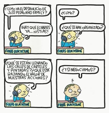 Este fondo buitre, que es el mayor propietario de vivienda del mundo, no ha dudado en subir las costas del alquiler a sus inquilinos e inquilinas acabando completamente con el carácter social original para el que se crearon estas viviendas. José Pedro y su familia no se pueden permitir una vivienda a precio de mercado ni al precio del alquiler que les exige Fidere, el nuevo propietario de su vivienda. José Pedro está en situación de desempleo y no recibe ningún tipo de subsidio, y su compañera trabaja en una gran superficie comercial a jornada parcial. Igualmente, han solicitado vivienda pública, y los servicios sociales les advierten que no les pueden ofrecer una alternativa habitacional, lo cual les deja en una situación de absoluta indefensión.