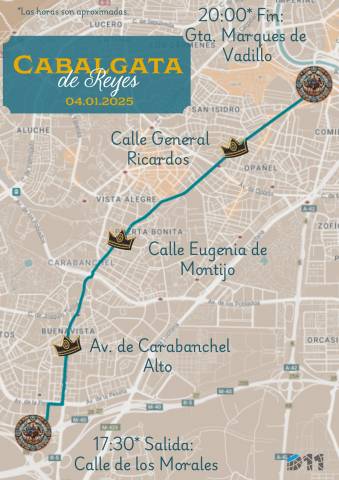 En Carabanchel, la cabalgata tendrá lugar el sábado día 4, con salida a las 17:30 en la calle Los Morales, en el PAU de Carabanchel, y final en la glorieta de Marqués de Vadillo, donde Sus Majestades los Reyes Magos recibirán las llaves del Distrito. La comitiva estará compuesta por un espectacular convoy que incluirá 5 carrozas municipales, 16 camiones de distintas entidades del Distrito, un trenecito, cuatro pasacalles de animación y las tres carrozas reales para Melchor, Gaspar y Baltasar.