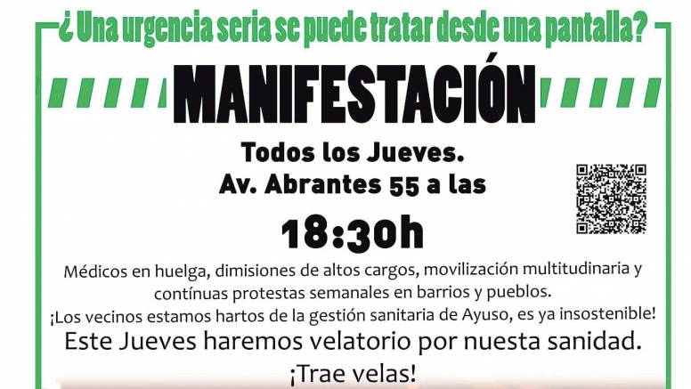 “Las urgencias de Atención Primaria siguen sin personal médico ni en Carabanchel ni en otros puntos de la Comunidad de Madrid. Siguen las movilizaciones y la lucha de los vecinos y vecinas junto al personal sanitario exigiendo mejoras en la sanidad pública. No vamos a permanecer de brazos cruzados viendo cómo desmantelan un derecho fundamental. Nos vemos de nuevo el jueves a las 18:30 desde el Centro de Salud de Abrantes (Avda. de Abrantes, 55)”, convocan desde la Asamblea Popular de Carabanchel. Este jueves 1 de diciembre además la idea es hacer un “velatorio”, por lo que se anima al vecindario a traer sus velas.
