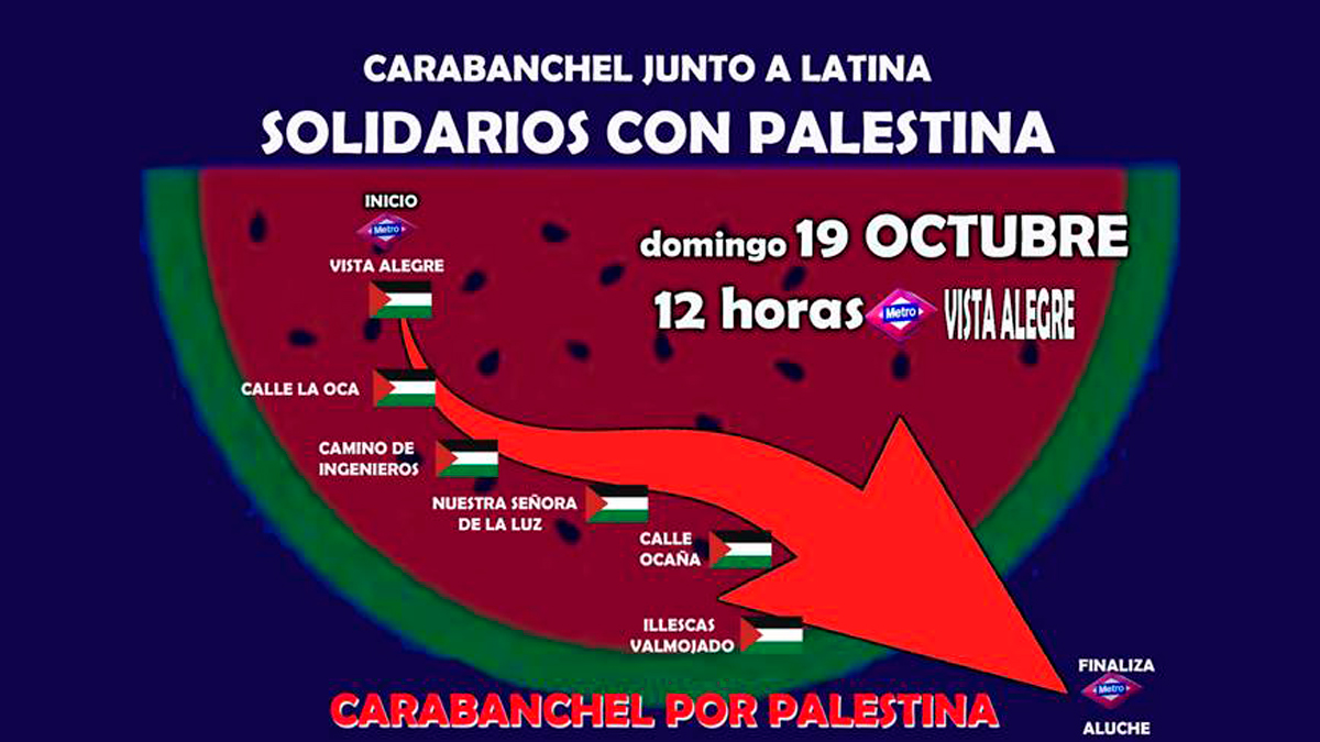El domingo 19 de octubre, convocada por Carabanchel con Palestina, tendrá lugar una manifestación contra el genocidio en Gaza que saldrá a las 12:00 del metro de Vista Alegre, uniéndose en el Parque de Aluche con la columna del Distrito Latina (convocada por la Coordinadora Vecinal de Latina) y marchando juntas el resto del recorrido para finalizar en el intercambiador de Aluche.