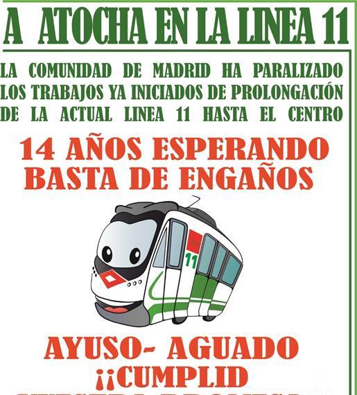 La Asociación de Vecinos de Carabanchel Alto organiza una marcha reivindicativa el viernes 16 de abril a favor de la prolongación de la Línea 11 de Metro hasta Atocha. La marcha inaugurará las estaciones previstas en el proyecto de ampliación de la Comunidad de Madrid.