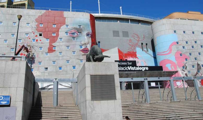 El mural más grande, no solo de Madrid, sino de toda España, estará en la fachada del Acceso Sur del Palacio Vistalegre, que da a la calle de Matilde Hernández. Allí, el reconocido artista madrileño Hugo Lomas, mucho más conocido como Sfhir, está pintando una enorme mujer que apela fijamente a los viandantes con mirada fascinante y melena roja.