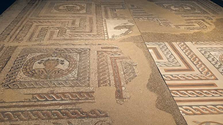 Mosaico con tipología de las cuatro estaciones, datado en los siglos IV-V d.C. Dimensiones: 5,50 m x 4,30 m. Confeccionado con técnica de opus tessellatum, con teselas de caliza, cerámica, mármol y pasta vítrea de colores rojo, rosado, ocre, azul, negro, verde y blanco.