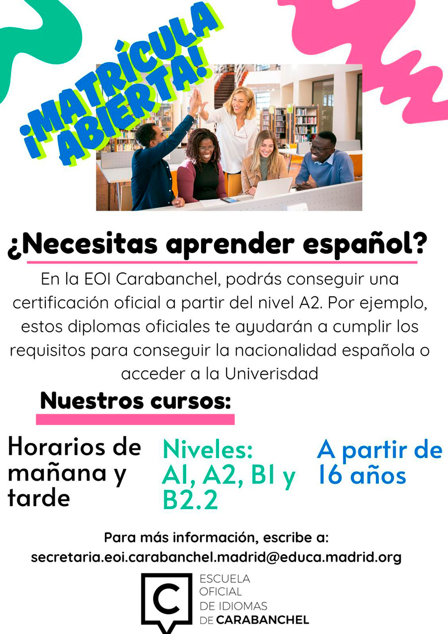 Para los interesados que no hayan estudiado español antes, pueden escribir directamente a secretaria.eoi.carabanchel.madrid@educa.madrid.org con una copia de su pasaporte o NIE, y para aquellos que tengan nivel de español pueden escribir a la misma dirección para apuntarse a la prueba de clasificación (19 euros) que se llevará a cabo el 29 de enero a las 12:00.