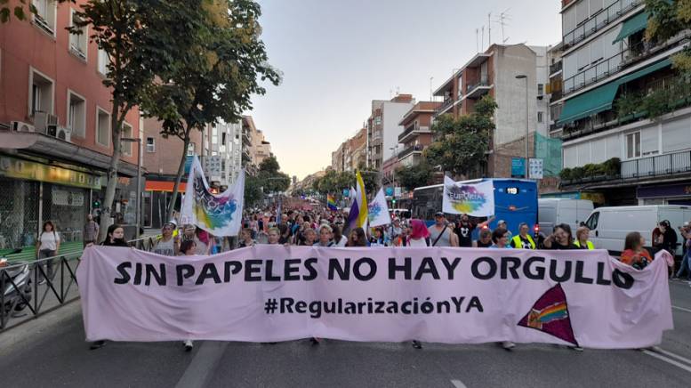 Como aspecto a destacar, este año Orgullo Crítico se ha aliado con la campaña Regularización Ya, movimiento estatal autoconvocado de colectivos y organizaciones por los derechos de las personas migrantes que demanda una Iniciativa Legislativa Popular para regularizar a las personas extranjeras que estuvieran viviendo en el Estado español antes del 1 de noviembre de 2021, reivindicación que ha estado muy presente durante toda la marcha, empezando por la pancarta de cabecera: “Sin papeles no hay orgullo”. El manifiesto unitario lo decía también muy claro: “¡Reclamamos el fin de la violencia, de las devoluciones en caliente, de los campos de refugiados, de las cárceles, de los CIE, de las fronteras y de las redadas! ¡Hasta que caiga el último muro y ardan todas las prisiones! Basta ya de este sistema imperialista y colonial que explota a los cuerpos racializados como mano de obra gratuita y deshumanizada”.