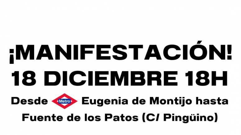 Tras la aprobación y presentación del período de alegaciones (abierto hasta el 23 de diciembre) al Proyecto de Urbanización del Plan Parcial de Reforma Interior del Área de Planeamiento Remitido 11.01 Cárcel de Carabanchel, consideramos que dicho plan urbanístico sigue sin respetar las demandas del vecindario en cuanto a su no afectación al Parque Eugenia de Montijo. Por este motivo, y tras más de un año de asambleas, reuniones, presentaciones, recogidas de firmas y publicación y reparto de un periódico sobre el proyecto, ha llegado el momento de convocar al vecindario de Carabanchel y Latina para manifestarse y defender nuestro parque.