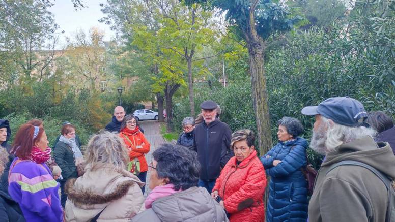 El divulgador medioambiental Luciano Labajos, con tres décadas de experiencia como jardinero del Ayuntamiento de Madrid, explica a los vecinos de este barrio de Carabanchel el patrimonio verde en peligro por las obras de la línea 11 de Metro