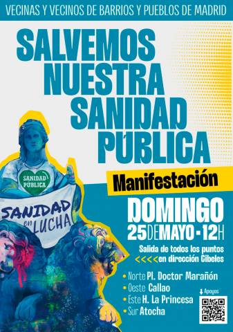Por eso llamamos a participar, el próximo domingo 25 de mayo, en una manifestación que bajo el lema “Salvemos nuestra sanidad pública”, que quiere visibilizar, mediante cuatro columnas que desde los cuatro puntos cardinales confluyan en la plaza de Cibeles, el rechazo profundo y extendido entre la ciudadanía por el estado crítico en el que se encuentra la sanidad pública madrileña.