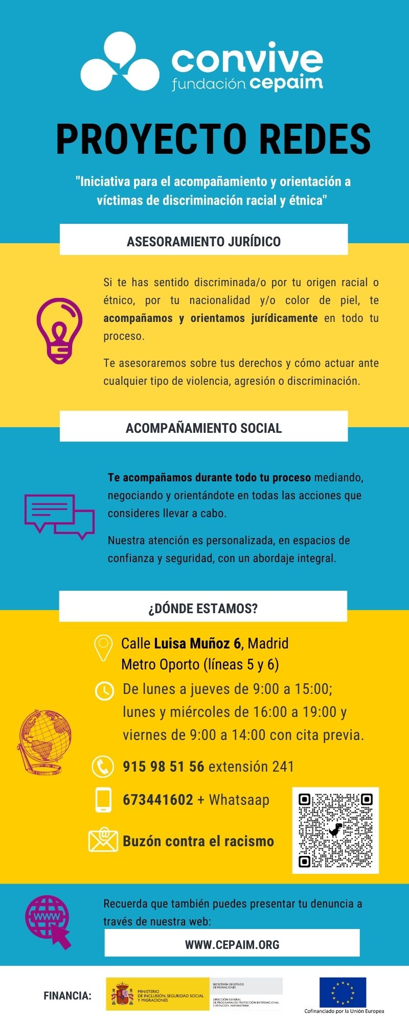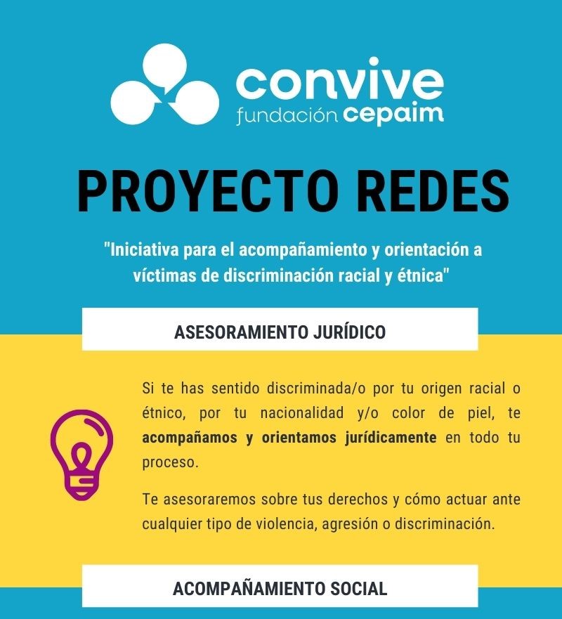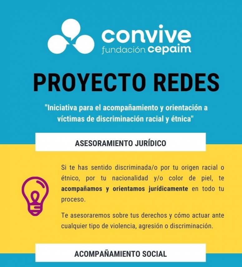 A través de dos proyectos, apostamos con recursos y herramientas para trabajar en red la lucha contra estas discriminaciones y violencias, asesorando y acompañando a todas aquellas personas que hayan sufrido un acto discriminatorio a consecuencia de su color de piel, origen racial o étnico.