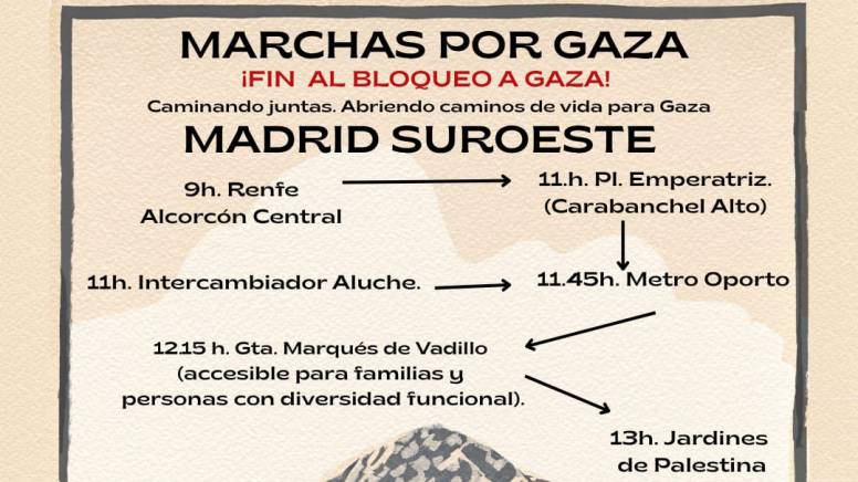 Las tres marchas (Norte, Suroeste y Sureste) confluirán en los Jardines de Palestina (Arganzuela), y desde allí, cruzando el Parque del Retiro, llegarán a la Casa Árabe, sumando en total 32 km.