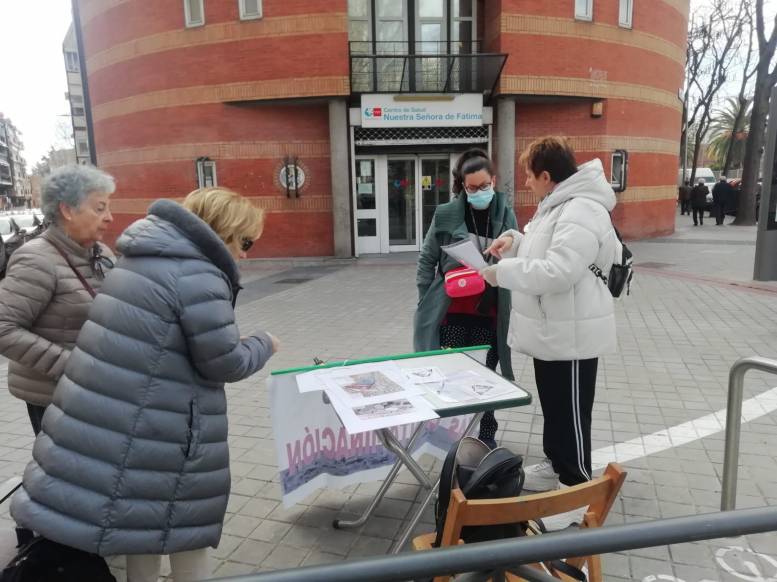 Salimos equipados con los planos e informaciones de la operación urbanística especulativa y las propuestas vecinales que hasta el momento todas las Administraciones públicas han ignorado o negado. Instalamos varias mesas informativas en puntos cercanos y afectados por el área a urbanizar, como las estaciones de metro de Carabanchel y Eugenia de Montijo y el Centro de Salud de Fátima.