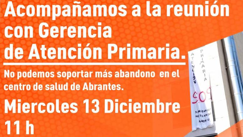 Miércoles 13 de diciembre a partir de las 11:00, acompañamiento ante Gerencia de Atención Primaria. Jueves 15 de diciembre a las 18:30, manifestación ante el Centro de Salud Abrantes
