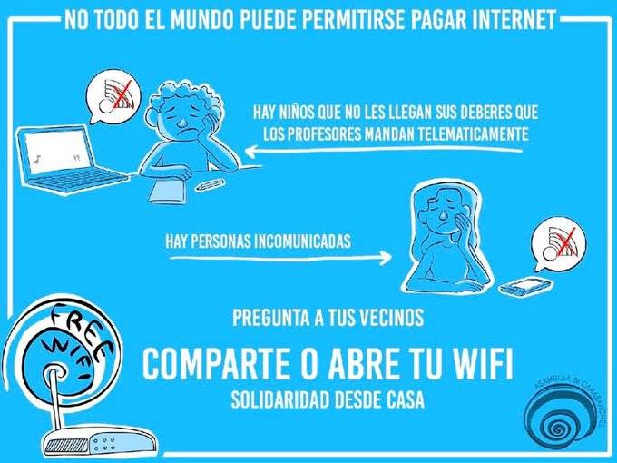 Desde la Asamblea Popular de Carabanchel seguimos aplicando dos de nuestros valores para afrontar esta situación: solidaridad y apoyo mutuo. Para ello, estamos realizando acciones propias, como el mantenimiento de nuestras asambleas de forma virtual, los domingos a las 12h en la plataforma Jitsi, tratando de superar la brecha digital que existe, ya que no todas las personas que participan en el colectivo tienen acceso a Internet. Por ello, hemos puesto en marcha la propuesta en los vecindarios para que la gente comparta su wifi.