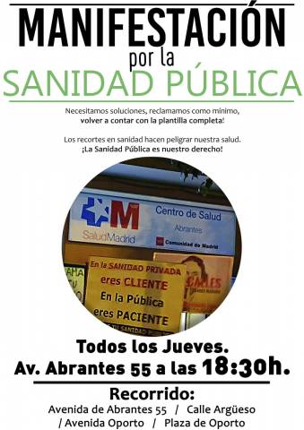 Aunque la lucha del vecindario del barrio de Abrantes está logrando algunas victorias, éstas se dan en un marco de degradación del conjunto de la sanidad pública madrileña. Por ello llamamos no solo a acudir este jueves a la ya tradicional manifestación ante el centro de Salud de Abrantes, sino a acudir también a la protesta contra la creciente privatización de servicios en el Hospital 12 de Octubre, el sábado 14. También animamos a acudir el lunes 16 a una nueva entrega masiva de reclamaciones contra el mal funcionamiento de la sanidad madrileña.