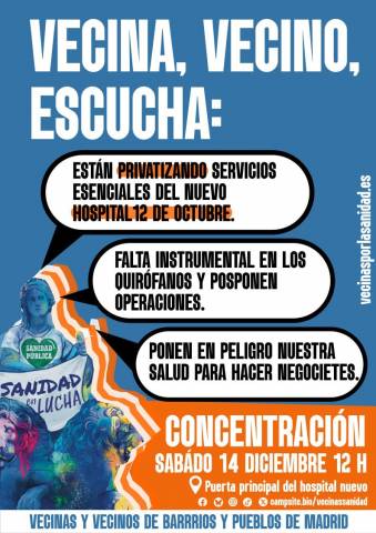 Ante esto llamamos a participar este sábado 14 de diciembre, a las 12:00, en una concentración de protesta ante la puerta principal del nuevo edificio del Hospital 12 de Octubre.