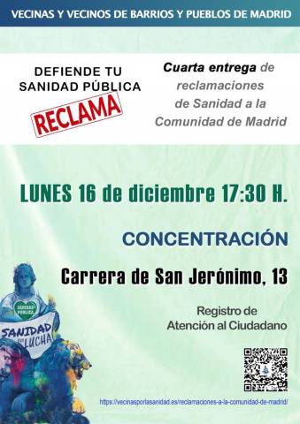 El lunes 16 de diciembre, Vecinas y Vecinos de Barrios y Pueblos de Madrid convoca una a concentración y a realizar una entrega masiva de reclamaciones, a las 17:30, en la Carrera San Jerónimo n.º 13.