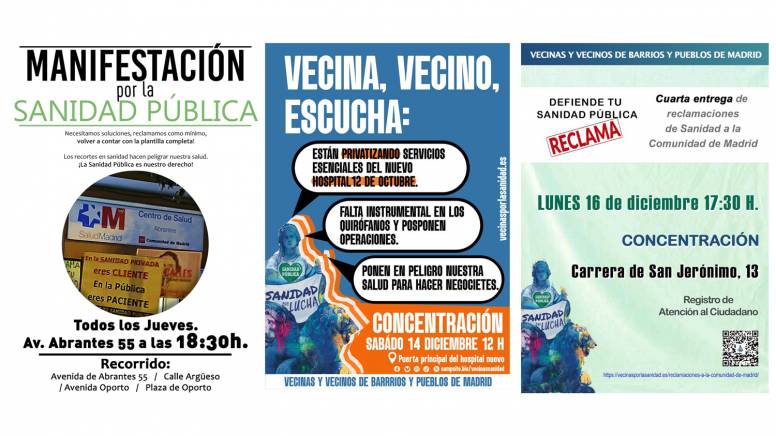 Jueves 12 de diciembre a las 18:30, manifestación ante el Centro de Salud Abrantes. Sábado 14 de diciembre a las 12:00, concentración ante la puerta principal del nuevo edificio del Hospital 12 de Octubre. Lunes 16 de diciembre a las 17:30, concentración y entrega masiva de reclamaciones en la Carrera San Jerónimo nº 13