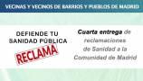 Por otro lado, la coordinadora Vecinas y Vecinos de Barrios y Pueblos de Madrid, que agrupa a diferentes plataformas de lucha en defensa de la sanidad pública, puso en marcha meses atrás una campaña de recogida de reclamaciones por diferentes barrios y pueblos de Madrid y su Comunidad. En las múltiples mesas ubicadas en los accesos a centros de salud y hospitales, los voluntarios de este movimiento preguntaban por la respuesta de la sanidad pública madrileña a la ciudadanía, interesándose por su situación personal, informándoles de sus derechos y ayudándoles en la realización de la reclamación. Hasta el momento ya se han registrado más de 20.000 reclamaciones en papel, y se ha informado de cómo realizarlo también a través de internet en la página web de la Consejería de Sanidad a tal efecto. Estas reclamaciones tienen relación con el retraso en la Atención Primaria donde, en algunos centros de salud, la espera sobrepasa el mes. También en consultas con especialista y pruebas diagnósticas, la ausencia de pediatras y, por último, la falta de médicos en las urgencias extrahospitalarias.