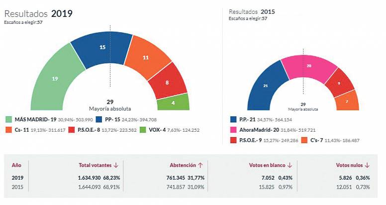 En las elecciones a la Comunidad de Madrid celebradas el mismo 26 de mayo ha pasado algo parecido a lo descrito sobre nuestra ciudad. En este caso, ha sido el PSOE el partido vencedor, con 37 escaños en la Asamblea regional (los mismos que en 2015), pero esta vez parece que tampoco va a conseguir recuperar la presidencia madrileña, pues no le llega con su alianza más probable. Una posible suma de los escaños de Más Madrid (20) y Unidas Podemos + IU + Madrid en Pie (7), que tras el fraccionamiento obtienen esta vez los mismos que hace cuatro años todos juntos, se quedaría a tres de la mayoría absoluta.