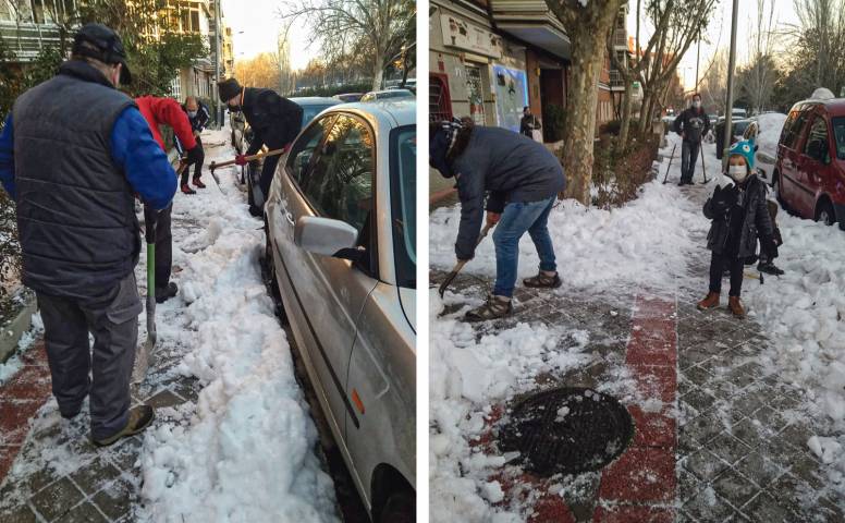 Intentando ayudar en la medida de lo posible, la Asociación de Vecinos Parque Eugenia de Montijo ha ofrecido diverso material (picos, palas, azadones, cepillos…) para facilitar la tarea de despejar accesos, limpiar y liberar pasos, además de “desenterrar” coches y salidas de garajes.