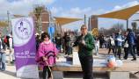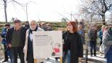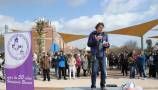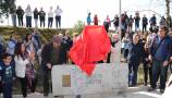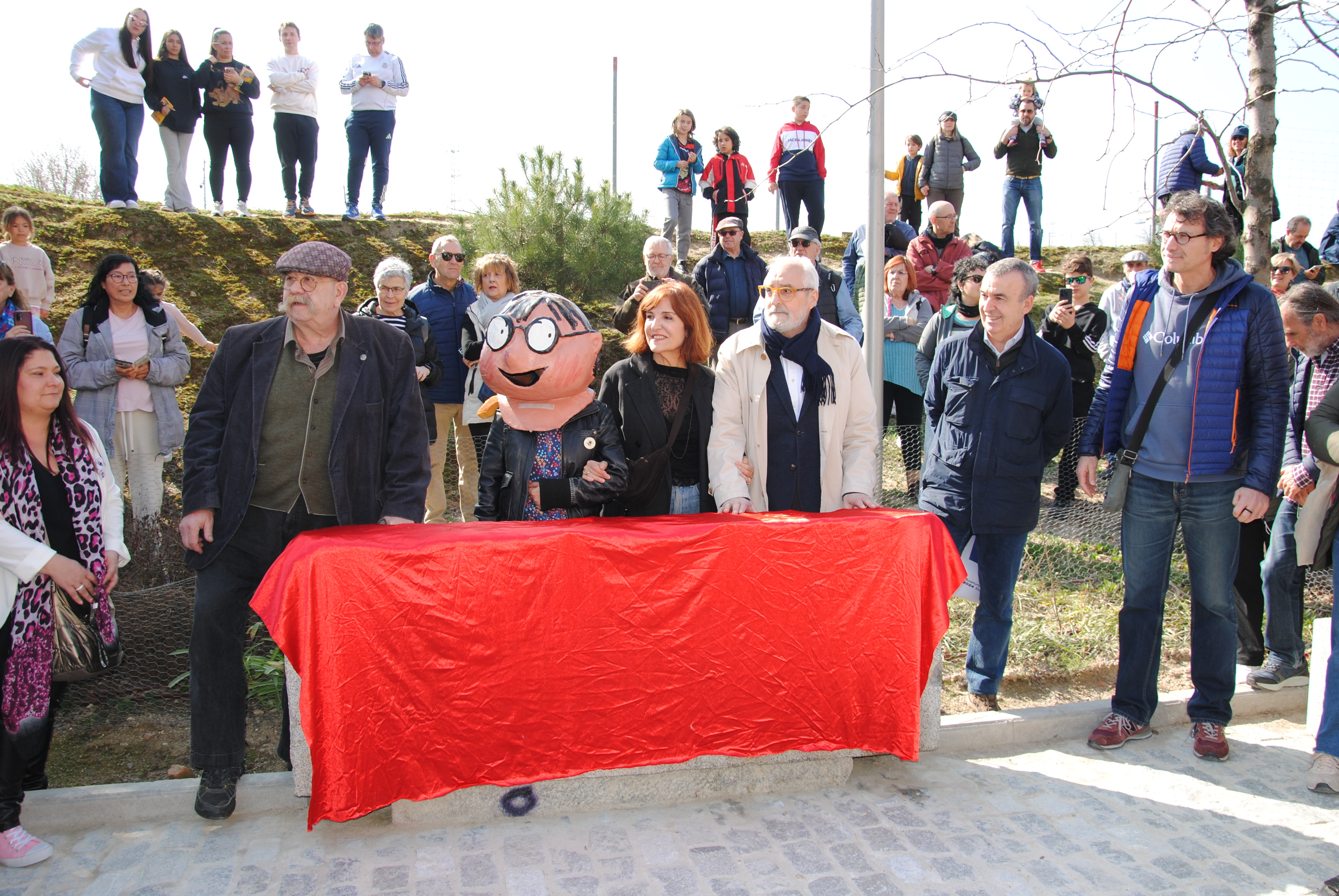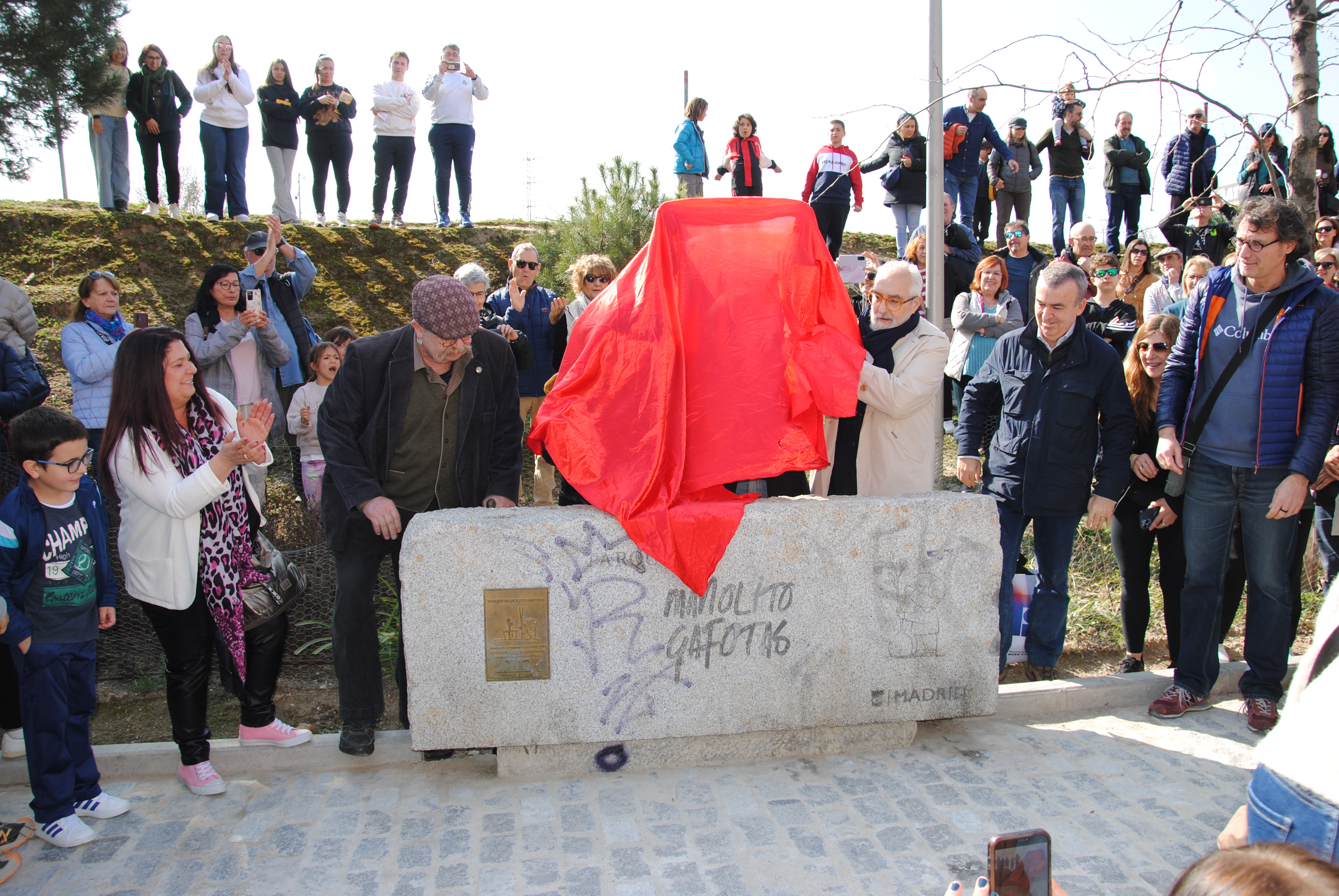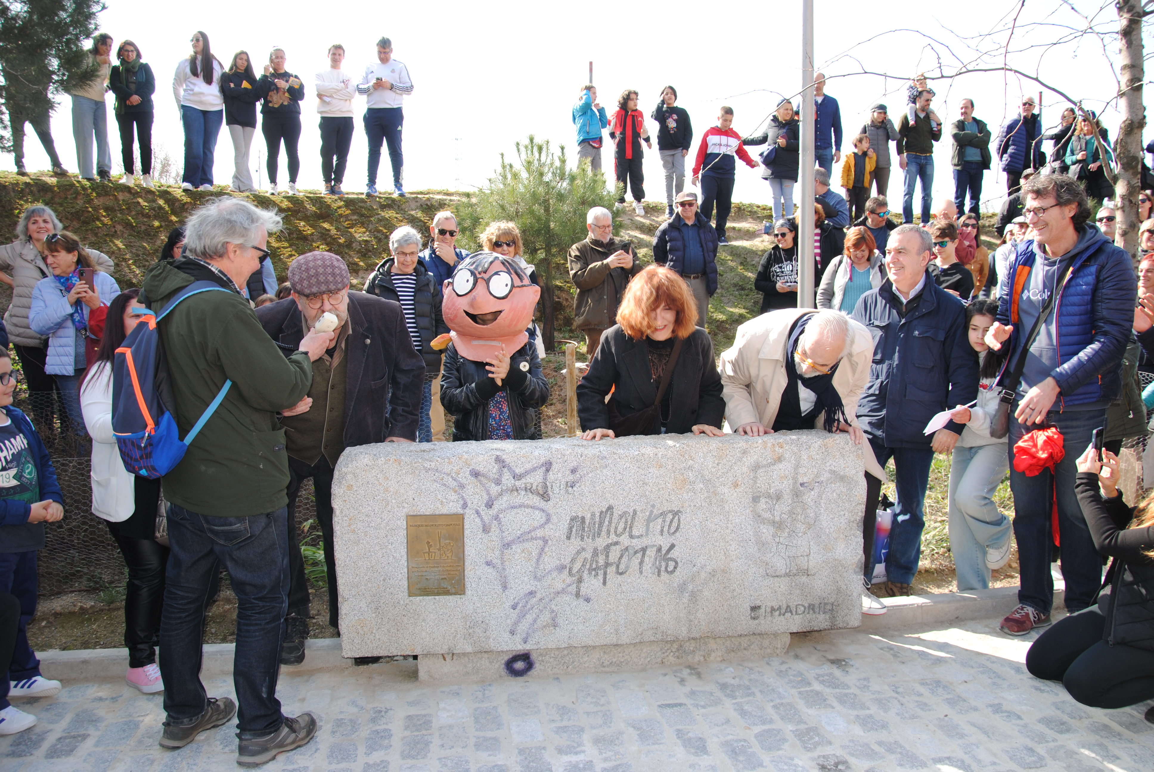 La concurrencia se fue multiplicando de camino al siguiente hito, el principio del parque, donde a las 12:00 nos encontramos con los invitados: el actor Ángel Jodra, los escritores Lorenzo Silva y Elvira Lindo (creadora del personaje de Manolito Gafotas) y el ilustrador Emilio Urberuaga. Ellos, junto a María Seco, presidenta de la A.V. de Carabanchel Alto, y Roberto Rodríguez, vecino del PAU y uno de los miembros de la asociación más destacados en la lucha por el parque, procedieron a levantar el velo de inauguración del monolito de Manolito.