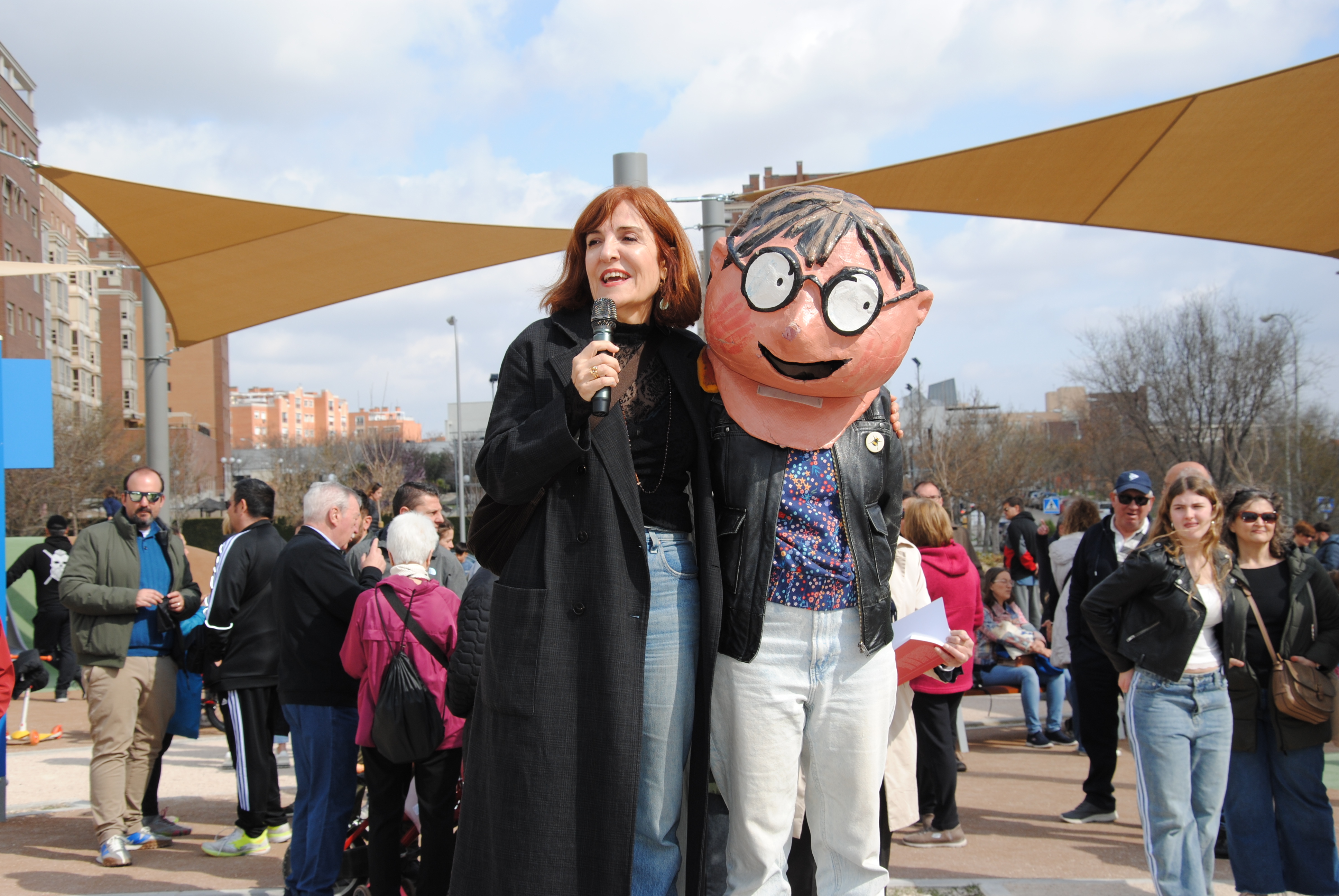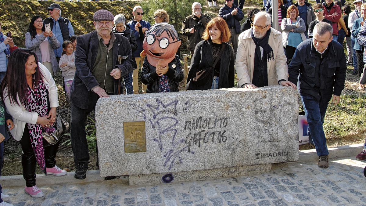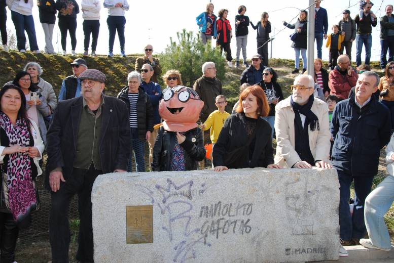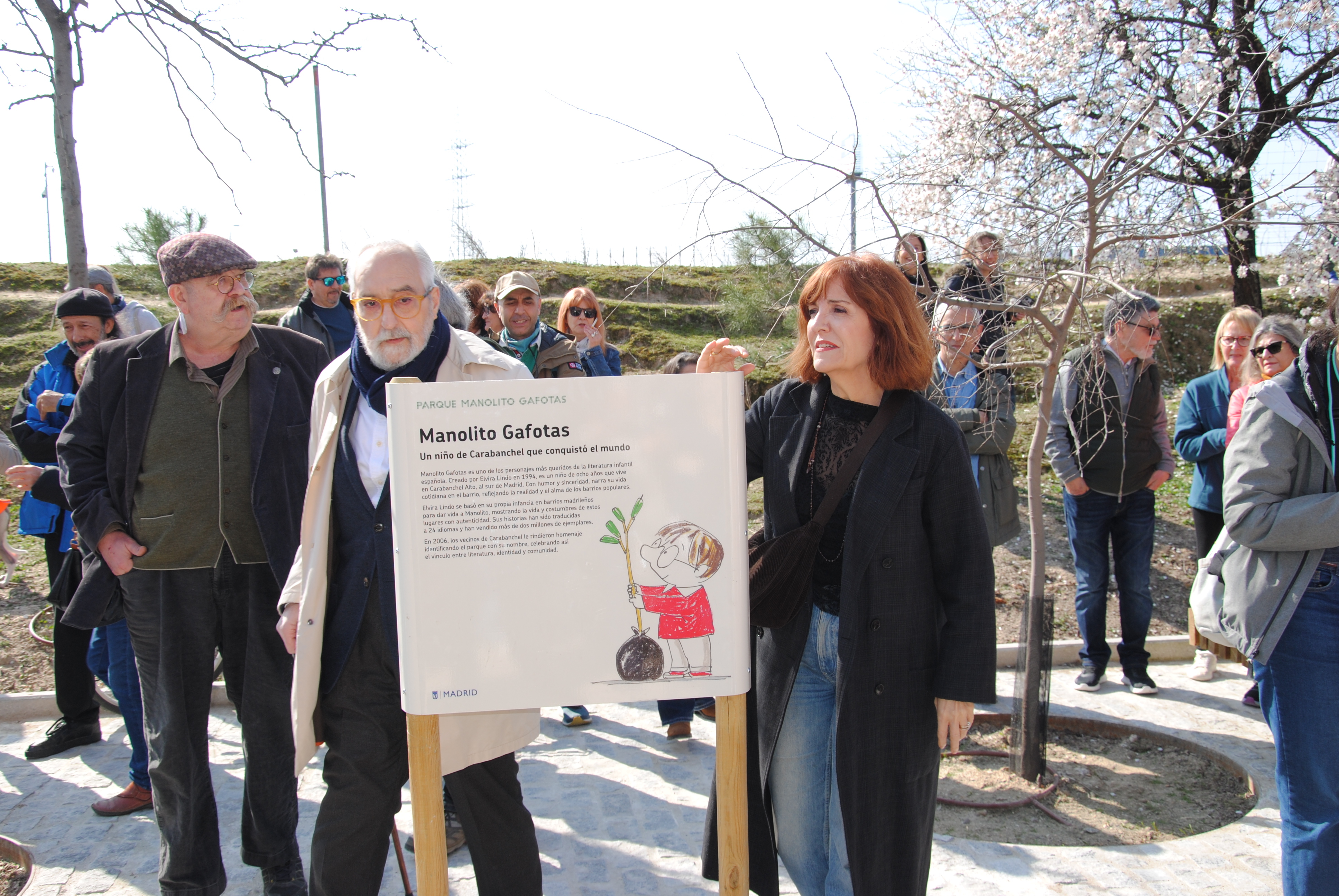 Intervino a continuación el ilustrador Emilio Urberuaga, creador de la imagen de Manolito Gafotas, quien agradeció el “maravilloso” recibimiento, y concluyó la ronda de intervenciones la escritora Elvira Lindo, creadora del personaje que protagoniza su exitosísima serie literaria y da nombre al parque. “Muchas gracias por invitarme —comenzó—. Es un honor que haya un parque que se llame Manolito Gafotas. El personaje nació aquí, es carabanchelero, pero ha viajado por todo el mundo. Es un personaje que tiene sus palabras en iraní, que lo están pasando tan mal estos días… En Irán, en Japón, en China, en italiano, en francés, en inglés, en checo... Imaginaos hasta dónde ha llegado Carabanchel. Y en todos esos libros, en diversos idiomas, está el nombre de Carabanchel Alto. Así que ha viajado muy bien, sigue leyéndose, sigue vivo, sigue siendo tan famoso, muchísimo más famoso que yo... Es un gusto: un parque es lo más bonito que se le puede dar a alguien que escribe. Porque es aquí donde van a venir los niños a jugar, las madres, los padres, las abuelas... Donde se hace verdaderamente el barrio. Así que muchísimas gracias por invitarme. Y que crezcan los árboles y lo podamos disfrutar muchísimos años. Gracias, vecinos de Carabanchel Alto”.