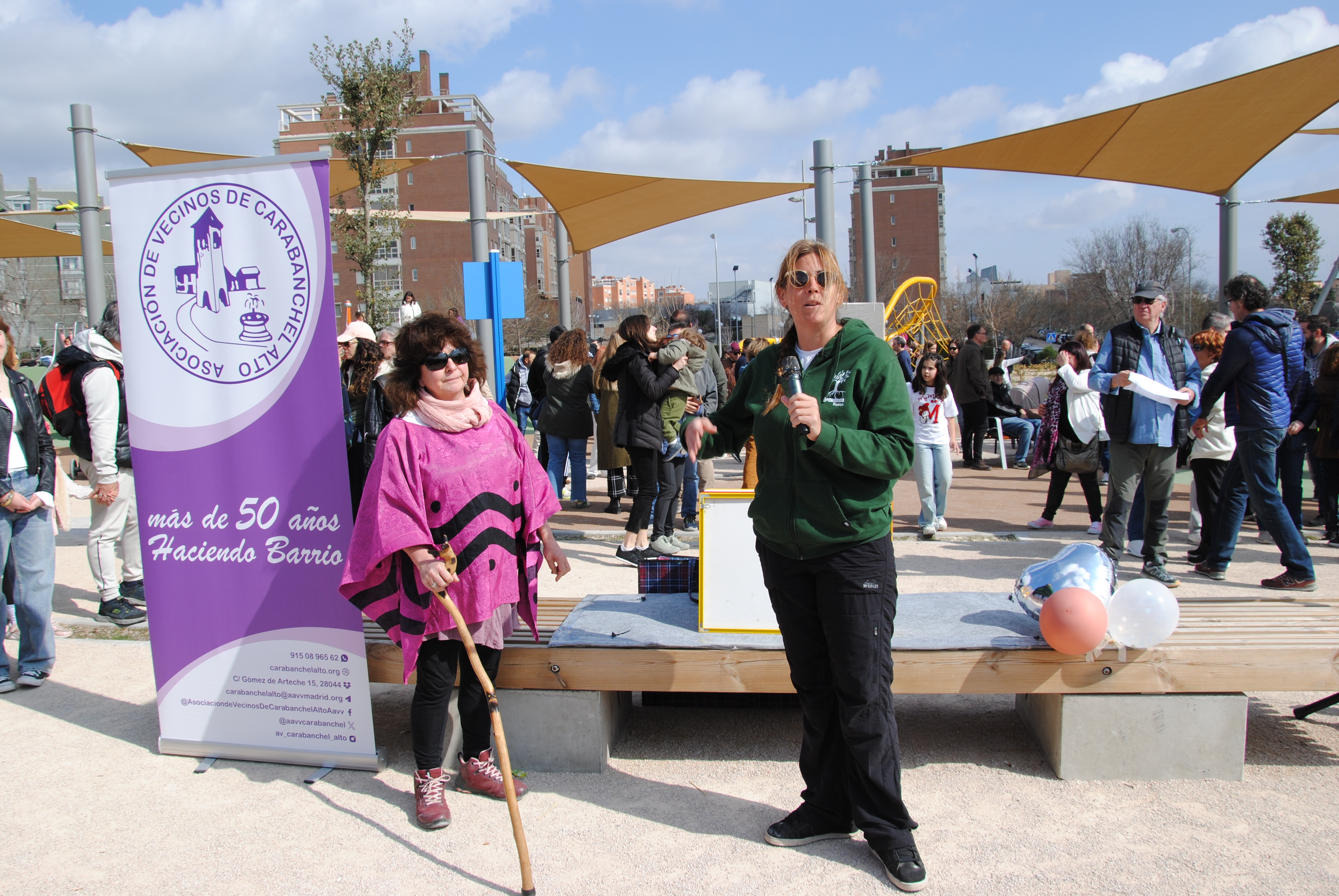 María Seco, presidenta de la asociación, dio el toque “institucional” en su discurso: “Hoy, 1 de marzo del 2026, inauguramos oficialmente el Parque Manolito Gafotas. Y no es un parque cualquiera: es nuestro parque, el que hemos construido con nuestras manos, con nuestras ganas y con nuestro espíritu; ese espíritu tan bonito que tiene Carabanchel cuando decide hacer barrio de verdad. Este parque no ha nacido de la nada: ha nacido del esfuerzo de muchos vecinos, del empuje incansable de la asociación de vecinos y de tantos colectivos y personas que sin afán de lucro han ido echando una mano, pala a pala, idea a idea, sonrisa a sonrisa. Porque cuando un barrio se une, pasan cosas maravillosas”, estableció.