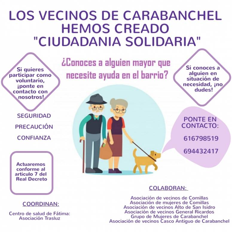 El Centro de Salud de Fátima y la Asociación Trasluz coordinan Ciudadanía Solidaria, donde también participan otras asociaciones de Carabanchel como, Asociación de vecinos de Comillas, Asociación de mujeres de Comillas, Asociación de vecinos Alto de San Isidro, Asociación de Vecinos General Ricardos, Grupo de Mujeres de Carabanchel y la Asociación de Vecinos Casco Antiguo de Carabanchel Bajo. Todo esto, no habría sido posible sin el trabajo sin descanso de Ana (Asociación Trasluz) y Sole (Centro Salud de Fátima).