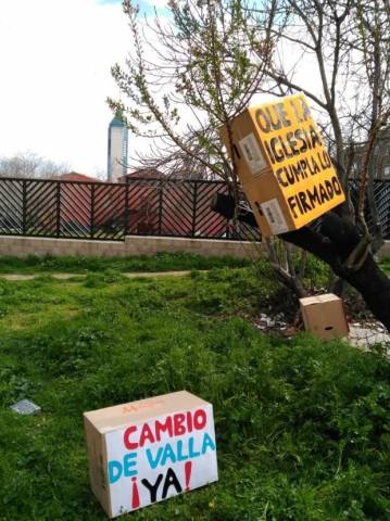 “Ante el retraso deliberado por parte de la iglesia de cambiar la valla a pesar de haberse aprobado en el pleno del ayuntamiento de Madrid de julio de 2017, volvemos a la calle”, advertía en sus redes sociales la Asociación Cultural Plataforma Opañel La Higuera y El Almendro. Y así lo hicieron el pasado domingo 25 de marzo, concentrándose frente a la Parroquia Santa Catalina Labouré para exigir que se respete el acuerdo firmado hace un año entre la Junta de Distrito y el Arzobispado, que establecía la nueva delimitación de las parcelas para destinar el terreno anexo a la parroquia a la construcción de una biblioteca para el barrio.Decididos a retomar las movilizaciones hasta que se cumpla lo firmado, y convocados por la asociación a las 12:00, los vecinos acudieron a la protesta y colocaron delante de la valla cajas de colores con mensajes como “Cambio de la valla ¡ya!”, “Cambio ya está firmado” o “Que la Iglesia cumpla lo firmado”.