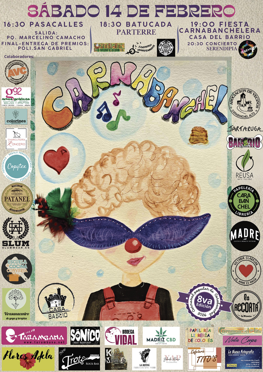 Anota la fecha: sábado 14 de febrero, gran pasacalles de Carnabanchel 2026. ¿Romántico? Bueno, preferimos pensar que el amor por el barrio no tiene fecha señalada, pero está claro que ofrecerle el carnaval popular que se merece año tras año es la mejor forma de demostrarlo. Partiremos del Parque de Marcelino Camacho a las 16:30 y acabaremos en el pabellón cubierto del colegio San Gabriel. Desde ahí, os invitamos a terminar por todo lo alto el carnaval en La Casa del Barrio de Carabanchel con todo el funk y soul de Serendipia en directo.