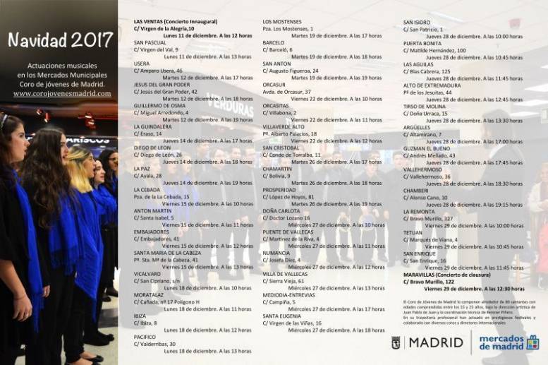 Como ya viene siendo tradicional este año los Mercados municipales vuelven a ofrecer a todos los visitantes un completo Programa de Conciertos ofrecidos por la Asociación Juvenil Coro de Jóvenes de Madrid, organizados desde la Dirección general de Comercio y Emprendimiento del Área de Gobierno de Equidad, Derechos Sociales y Empleo.