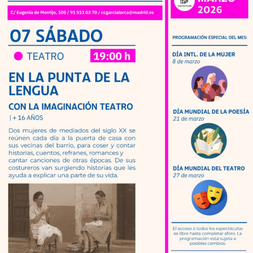 La obra escogida por el Centro Sociocultural García Lorca es En la punta de la lengua, de la compañía La imaginación teatro. Cuenta la historia de dos mujeres de mediados del siglo XX que se reúnen cada día con sus vecinas del barrio para coser y contar historias, cuentos y canciones de otras épocas con las que van explicando una parte oculta de sus vidas.