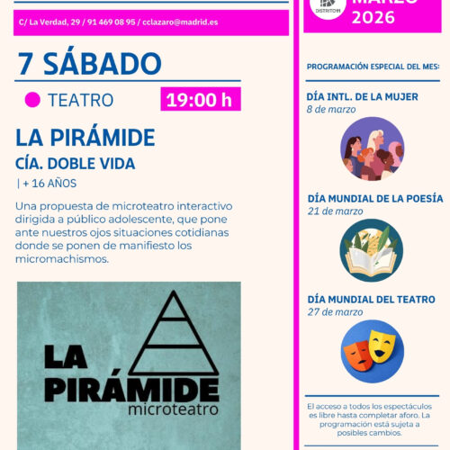 Una propuesta de microteatro interactivo dirigida a los adolescentes es la elección del Centro Cultural Fernando Lázaro Carreter para este día. La compañía Doble Vida presenta La Pirámide, que pone ante nuestros ojos situaciones cotidianas donde se manifiestan los micromachismos. Con la participación del público, el espectáculo invita a reflexionar desde la sorpresa y el juego.