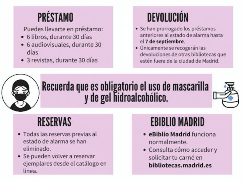 No se ofrecerá el servicio de préstamo interbibliotecario. Solo se recogerán devoluciones procedentes de bibliotecas ubicadas fuera de la ciudad de Madrid y que formen parte del Catálogo Único. Por otro lado, se ha ampliado el plazo de todos los préstamos realizados antes del confinamiento hasta el 7 de septiembre.
