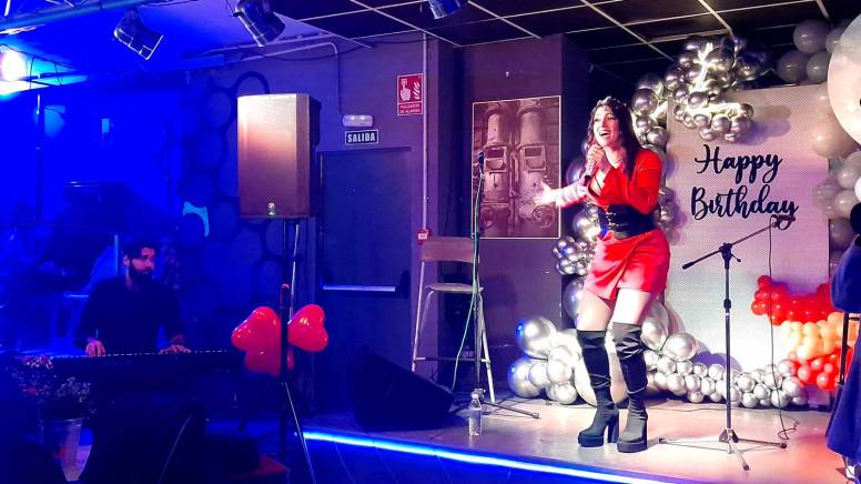 Pero además de la presentación, Miriam celebraba su cumpleaños y la sala estaba repleta de familiares y amigos. Y el ambiente festivo y las ganas de la artista de cantar y bailar con su gente sin duda favoreció que lo visto anoche superase mis expectativas (que ya eran buenas) e incluso me rompiera los esquemas. Porque aparte del estilo mencionado, que es por donde más o menos se mueve actualmente el proyecto musical de este torbellino de mujer y caracteriza los temas que compondrán su inminente álbum, Miriam nos deleitó también con algunos otros de un abanico estilístico mucho más amplio, desde la rumba hasta el pop, e incluso algún ramalazo rock en un tema divertidísimo dedicado a una “sustituta” suya.