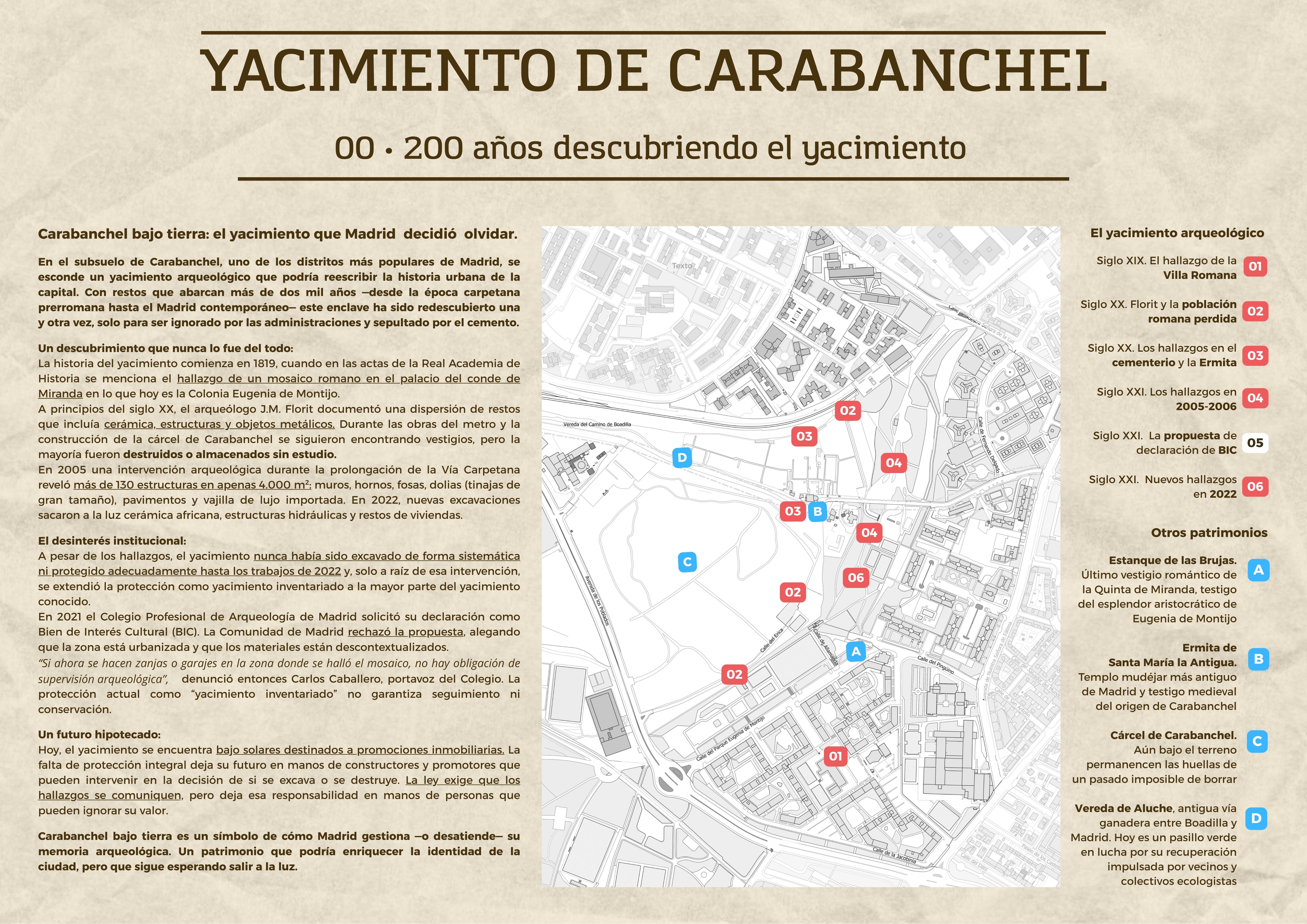 En el subsuelo de Carabanchel, uno de los distritos más populares de Madrid, se esconde un yacimiento arqueológico que podría reescribir la historia urbana de la capital. Con restos que abarcan más de dos mil años -desde la época carpetana prerromana hasta el Madrid contemporáneo-, este enclave ha sido redescubierto una y otra vez, solo para ser ignorado por las Administraciones y sepultado por el cemento.