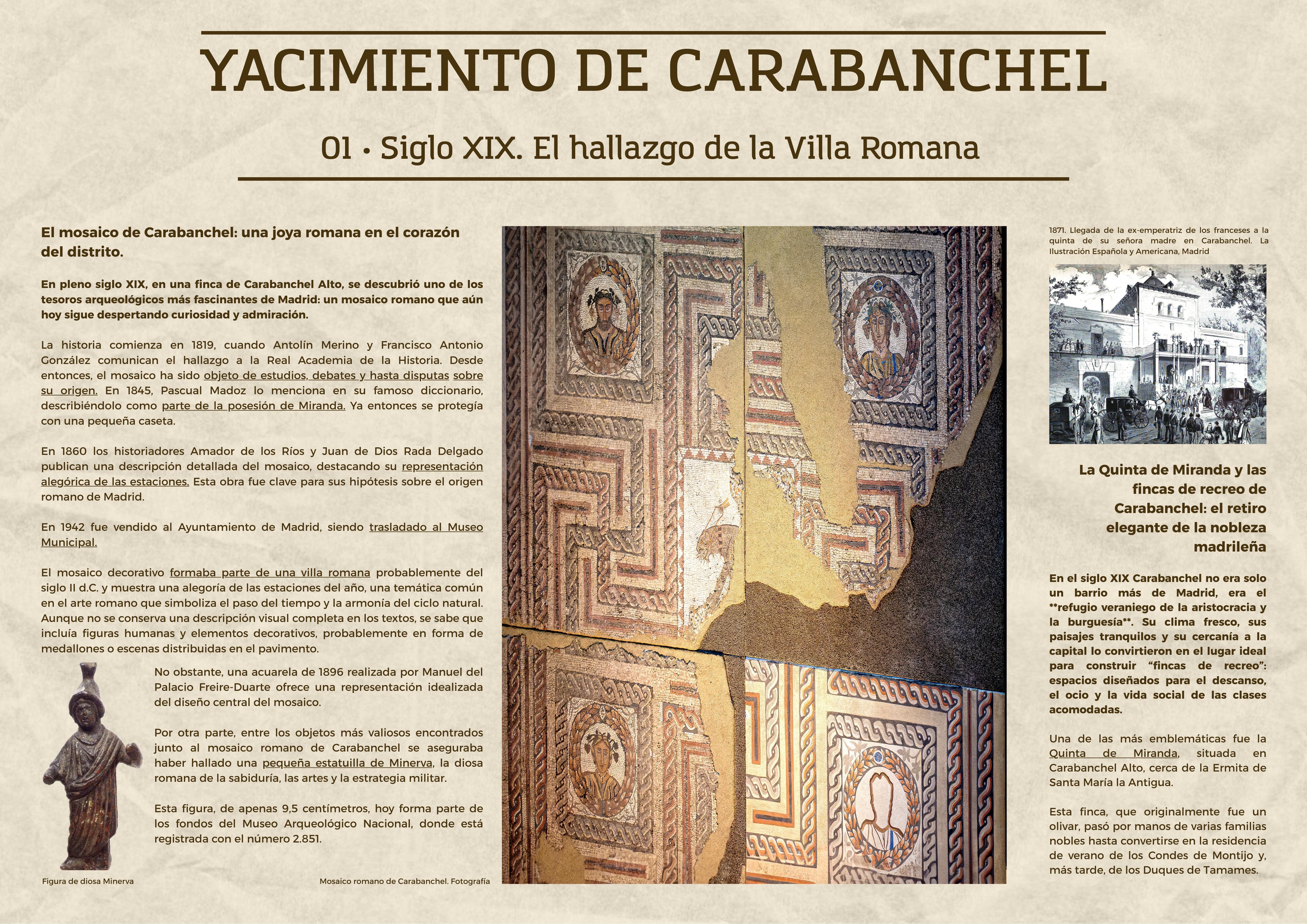La historia del yacimiento comienza en 1819, cuando en las actas de la Real Academia de Historia se menciona el hallazgo de un mosaico romano en el palacio del conde de Miranda, en lo que hoy es la Colonia Eugenia de Montijo.