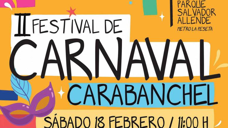 La II edición del Festival de Carnaval de Carabanchel tendrá lugar el sábado 18, de 11:00 a 13:30, en el parque Salvador Allende (calle de Salvador Allende, 3). Habrá pintacaras, disfraces, actividades deportivas y música, entre otras propuestas.