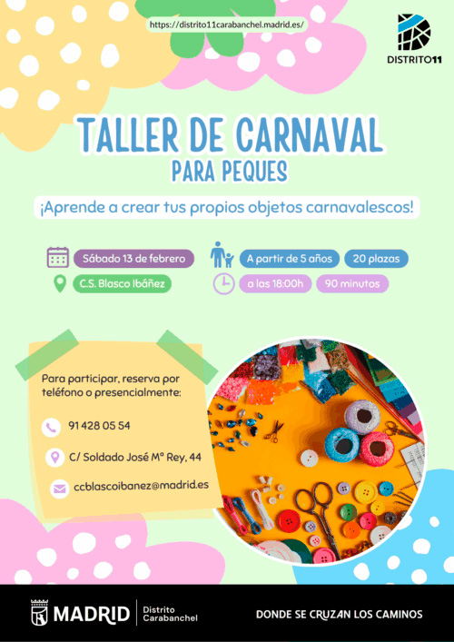 Carabanchel acoge el 14 de febrero la quinta edición del Festival de Carnaval, un encuentro lleno de juegos y espectáculos en el que no faltarán los disfraces. Para preparar la fiesta se organizan dos talleres infantiles donde los más pequeños podrán crear y desarrollar su imaginación. Además, los centros culturales incluyen en su programación más espectáculos carnavalescos que traerán música y cuentos a Distrito 11.