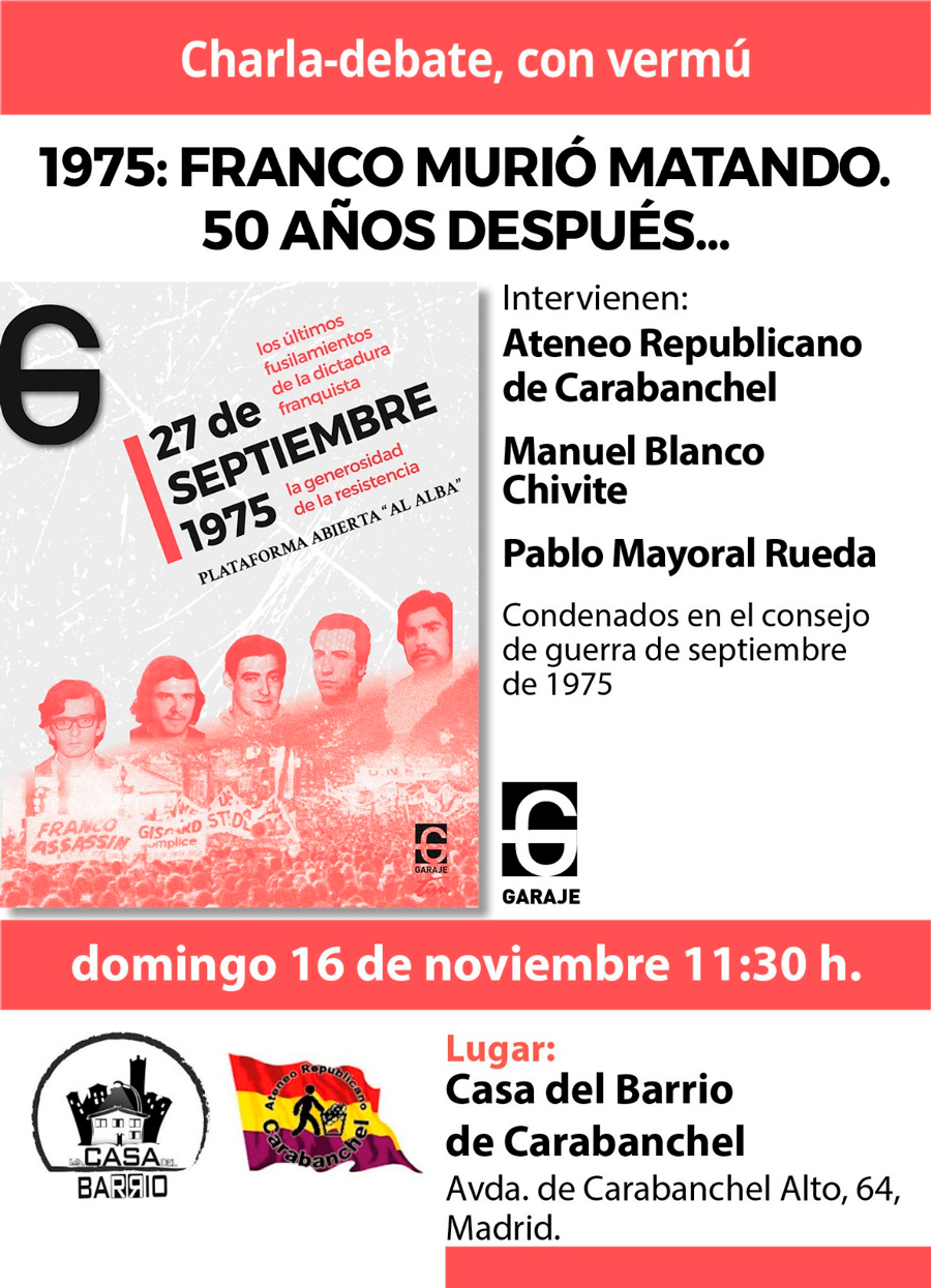Este fin de semana, la Casa del Barrio y el Ateneo Republicano de Carabanchel organizan una interesante charla, en el marco del medio siglo pasado desde la muerte del dictador, bajo el título “1975: Franco murió matando. 50 años después’, que nos acercará a los últimos fusilamientos de la dictadura franquista, realizados el 27 de septiembre de 1975.