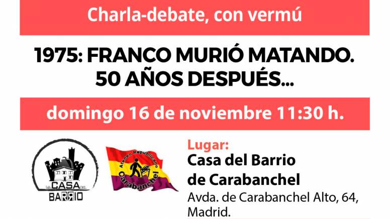 Será el domingo 16 de noviembre, a las 11:30, en la Casa del Barrio de Carabanchel (Avda. de Carabanchel Alto, 64), e intervendrán en ella, además del Ateneo Republicano de Carabanchel, Manuel Blanco Chivite y Pablo Mayoral Rueda, condenados en el consejo de guerra de septiembre de 1975.