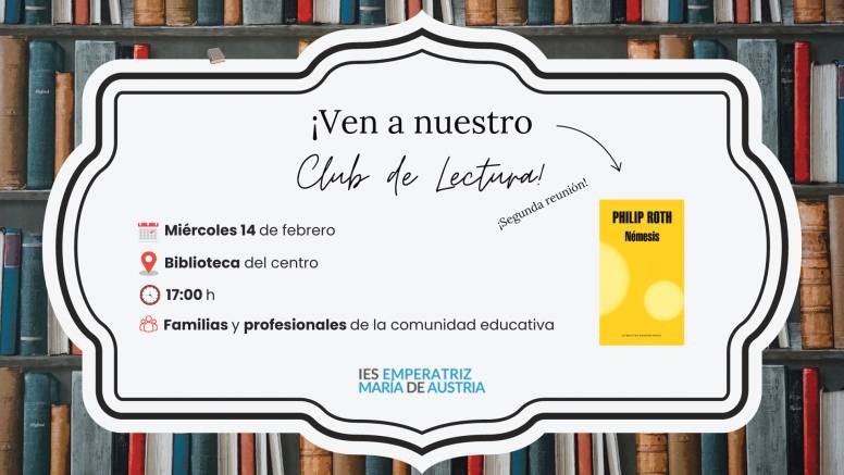 La segunda sesión tendrá lugar el miércoles 14 de febrero, en el mismo lugar, a las 17:00. En este caso, la novela escogida será Némesis, de Philip Roth. Las personas interesadas en formar parte del club de lectura deberán leer la novela para la fecha acordada.
