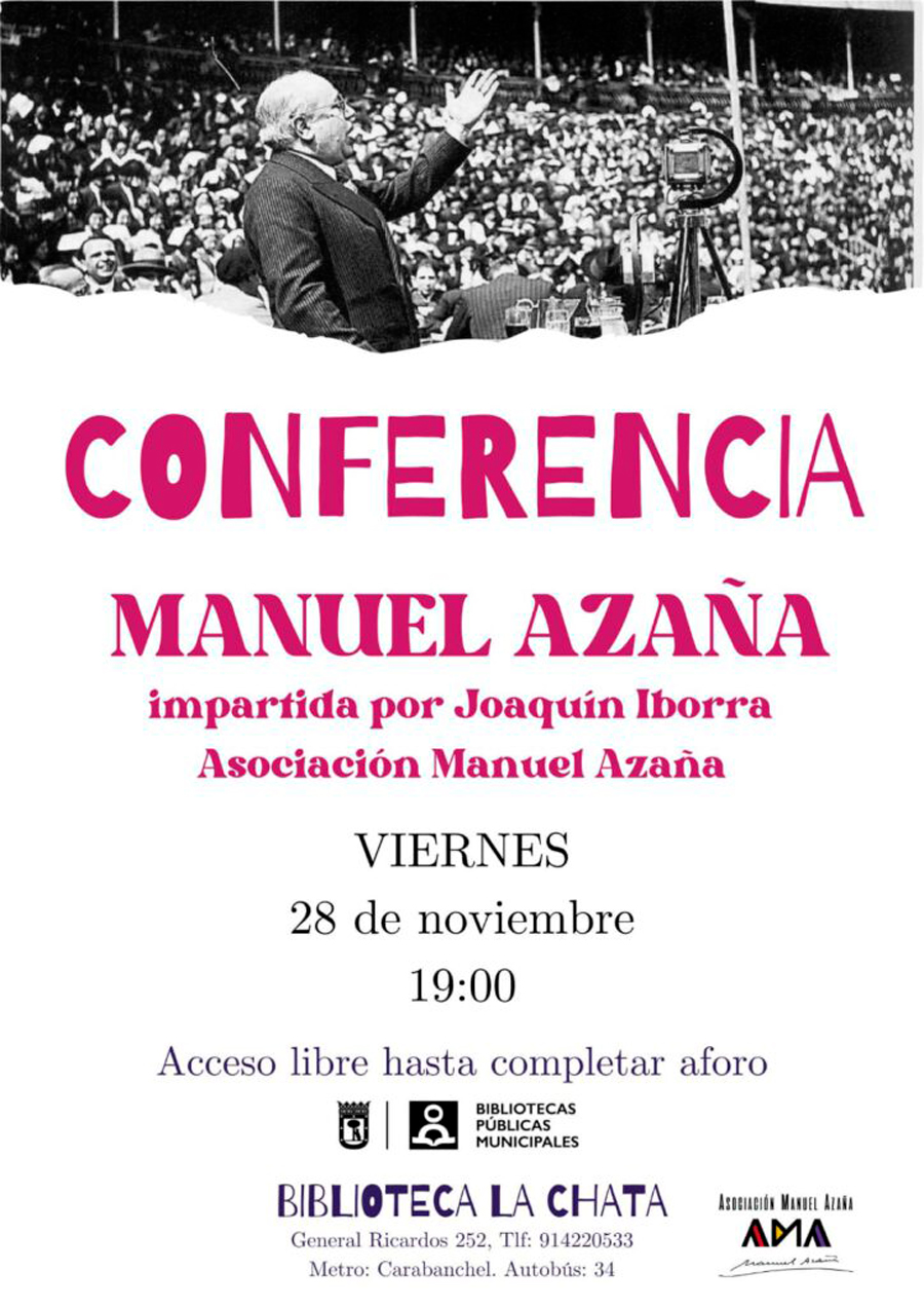Esta tarde, a partir de las 19:00 en la Biblioteca pública Municipal La Chata (C/ del General Ricardos, 252), el historiador e investigador Joaquín Iborra dará una conferencia sobre Manuel Azaña y la II República. El acceso será libre hasta completar aforo.
