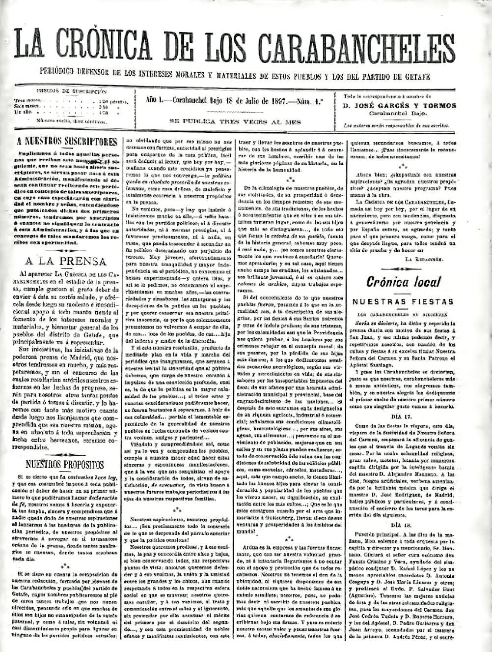 En plena efervescencia de la Restauración borbónica y a las puertas del Desastre del 98, un pequeño periódico local surgía en los entonces municipios independientes de Carabanchel Alto y Bajo: La Crónica de los Carabancheles.