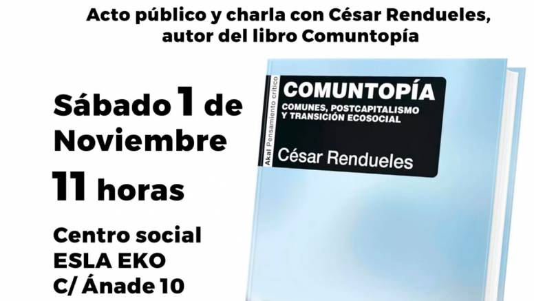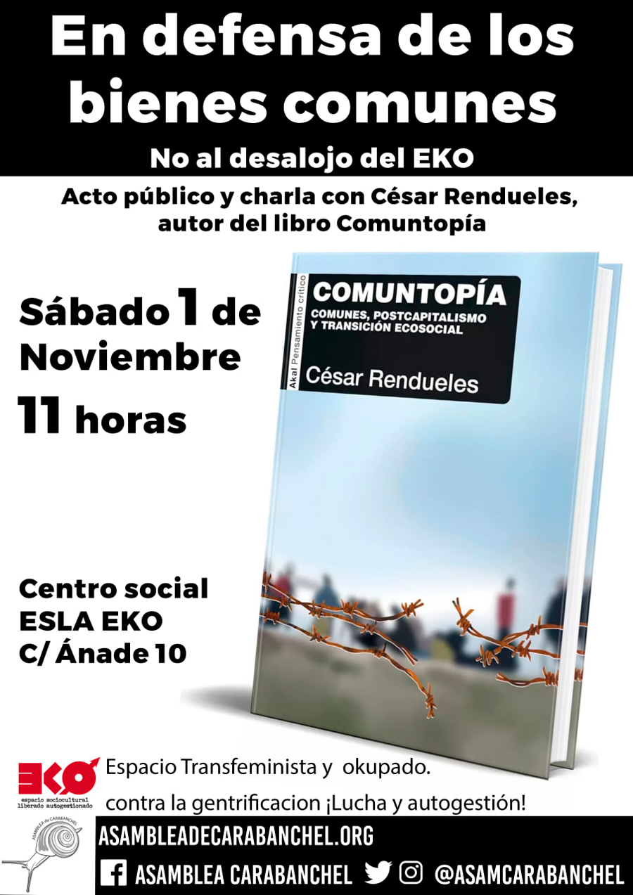 Pero no todas las personas nos resignamos ni queremos permanecer pasivos ante los acontecimientos. Hay quienes queremos construir una sociedad más justa y humana. Somos quienes no nos queremos resignar ante el capitalismo. Para esa tarea es muy necesario, quizá prioritario, hacer una reflexión y tratar de entender la sociedad y las alternativas posibles. La historia está llena de personas que ya lucharon. Sus experiencias, logros y conquistas no son solo dignas de admiración. También pueden servirnos sobremanera para las tareas enormes que hoy afrontamos. Una gran desconocida es la experiencia de los denominados “bienes comunes”. En estos tiempos, cuando la lógica individualista y de mercado parece la única posible, queremos conocer y explorar otras posibilidades reales y que han jugado y juegan un papel. Igual que el centro social Eko es de todas y todes y no es de nadie, es del barrio y de la multitud de personas e iniciativas que lo llenan y le dan cuerpo.