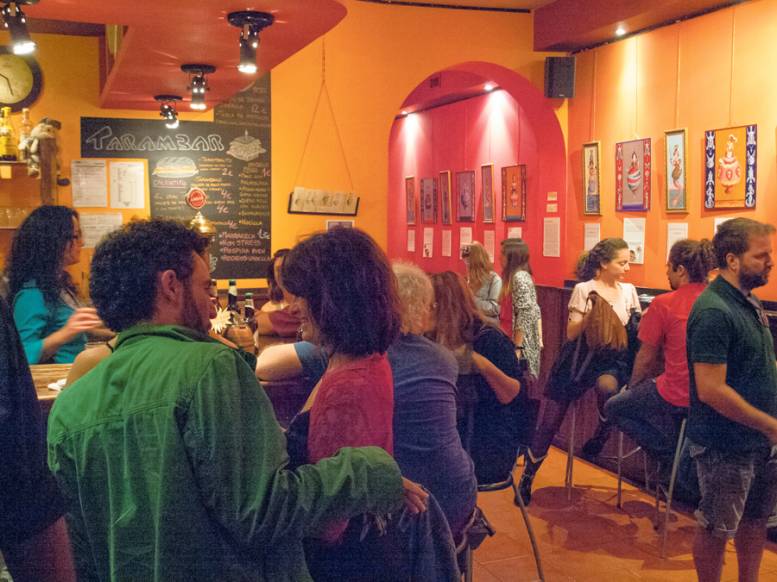 En los inicios eran ocho socios (hoy quedan seis), y hay importante participación familiar: los hermanos de Nacho arriman también el hombro, y de hecho uno de ellos, Santi, se encarga de la gerencia en la época en la que compagina empleos. Al principio se trata de conseguir trabajos que mantengan el proyecto, “sobre todo de animaciones, cosas relacionadas con la escena, pero un poco más para sacar el día a día. Sí que es verdad que el bar en aquella época funcionaba bien. Estuvimos sin subvenciones por lo menos tres años, pero el bar nos proporcionaba ese soporte para poder seguir trabajando”. Aunque los principios fueron difíciles, la Sala Tarambana nace con mucha fuerza: en estos primeros tiempos, especialmente con el Match de Impro, llenan constantemente.
