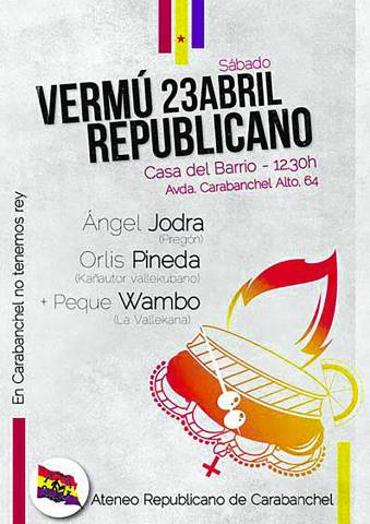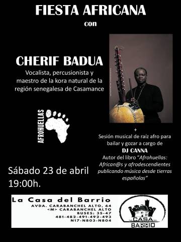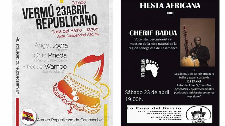 Desde la Casa del Barrio (avenida de Carabanchel Alto, 64) nos llegan dos planes para el sábado 23 de abril. En primer lugar, a partir de las 12:30, el Ateneo Republicano de Carabanchel ha organizado allí un Vermú republicano, que además de lo que el propio nombre del evento indica contará con lectura de pregón a cargo de Ángel Jodra y la actuación de Orlis Pineda (kañautor vallekubano) y Peque Wambo (La Vallekana). Y por la tarde-noche, fiesta africana a partir de las 19:00 con Cherif Badua, vocalista, percusionista y maestro de la kora natural de la región senegalesa de Casamance. Para terminar la fiesta bien arriba, habrá sesión musical de raíz afro para bailar y gozar a cargo de DJ Canna, autor del libro Afrohuellas: african@s y afrodescendientes publicando música desde tierras españolas.