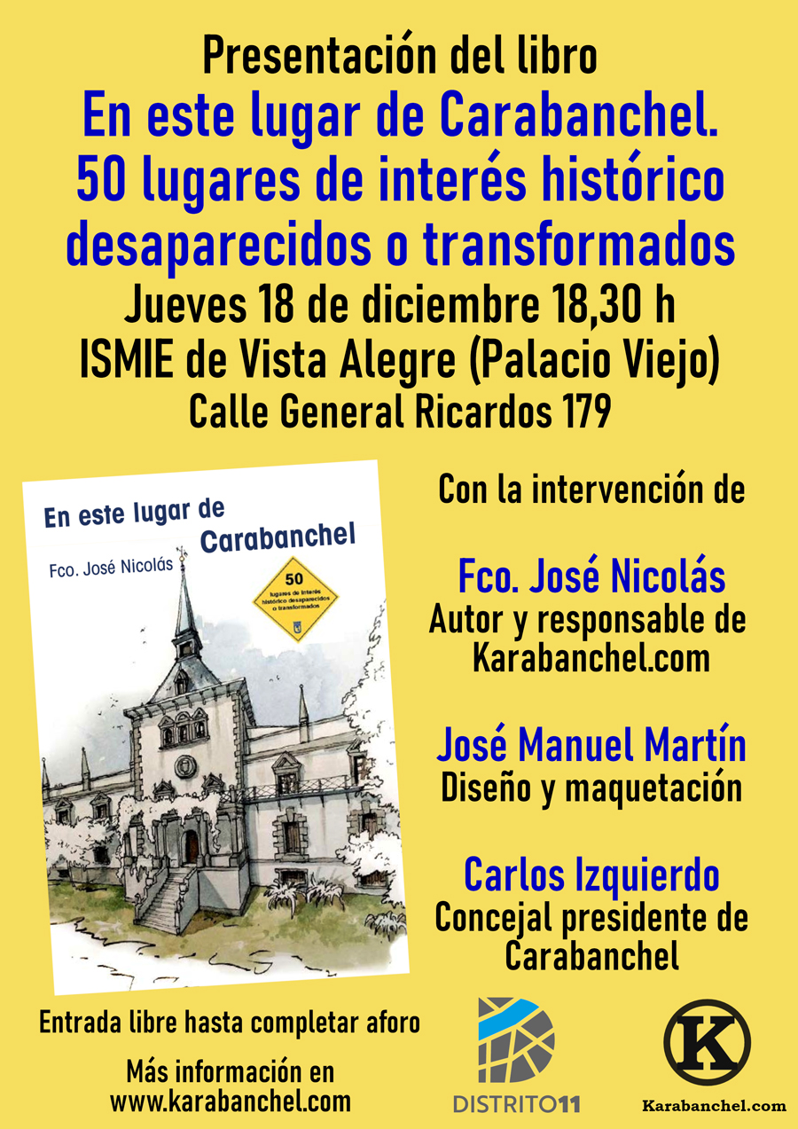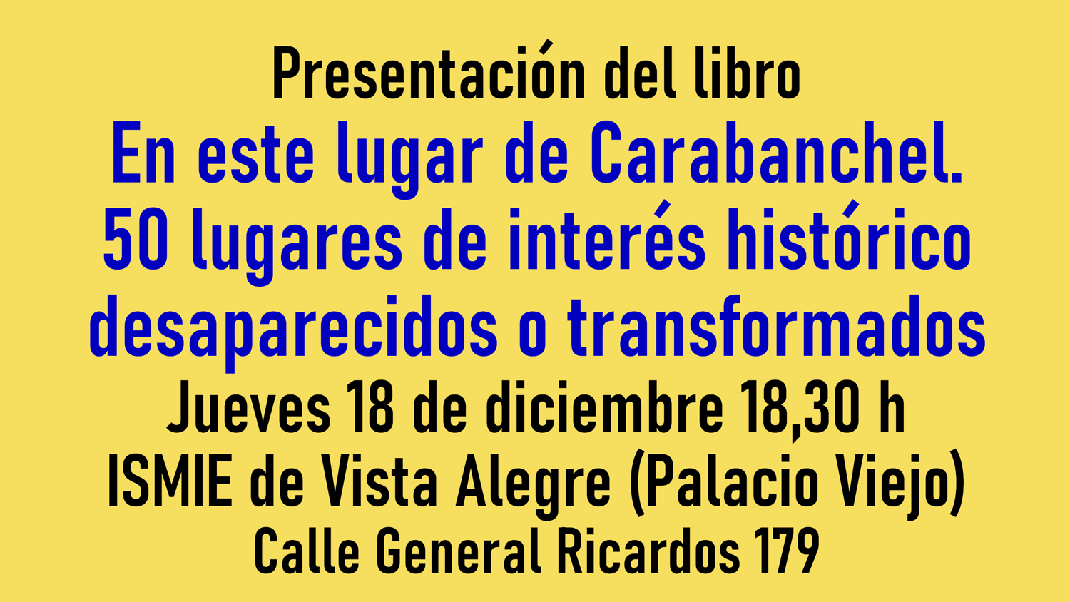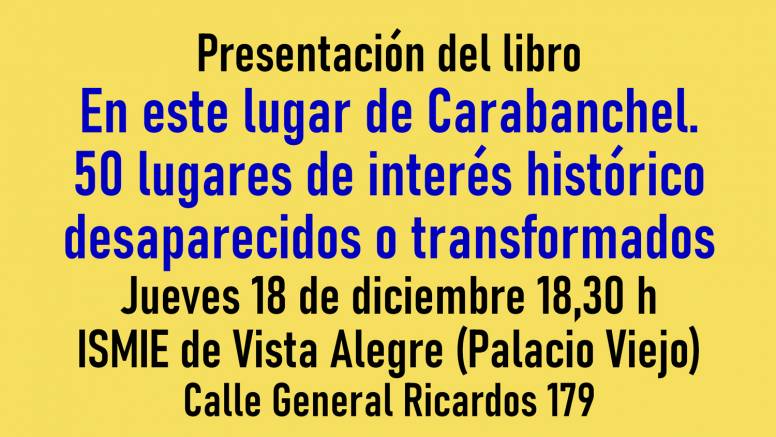 Hoy, jueves 18 de diciembre, a las 18:30, tendrá lugar la presentación del libro En este lugar de Carabanchel. Cincuenta lugares de interés histórico desaparecidos o transformados en el ISMIE (Instituto Superior Madrileño de Innovación Educativa), ubicado en el Palacio Viejo de la Finca de Vista Alegre (acceso por la calle General Ricardos, 179). La entrada será libre hasta completar el aforo. También podéis confirmar vuestra asistencia a jmcarabanchel@madrid.es.