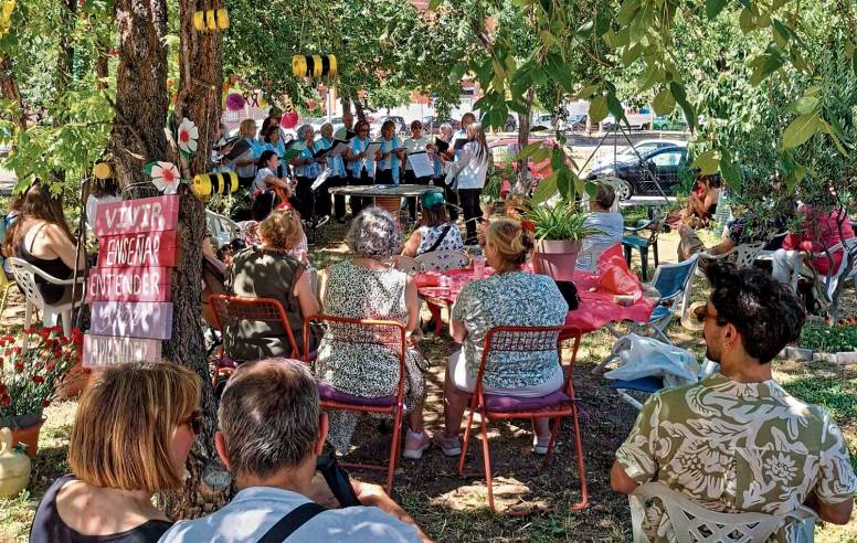 Entre las actuaciones esta vez contamos con el grupo de teatro del barrio La Imprenta, que se habían preparado unos textos que representaron estupendamente; y por la tarde, el grupo coral Nuestras Voces Amigas, que animaron la tarde con canciones madrileñas. Agradecemos mucho a los artistas invitados, porque ésta es una de las esencias del jardín: que forme parte de él todo el que lo desee y que sea lugar de crear y darse a conocer.